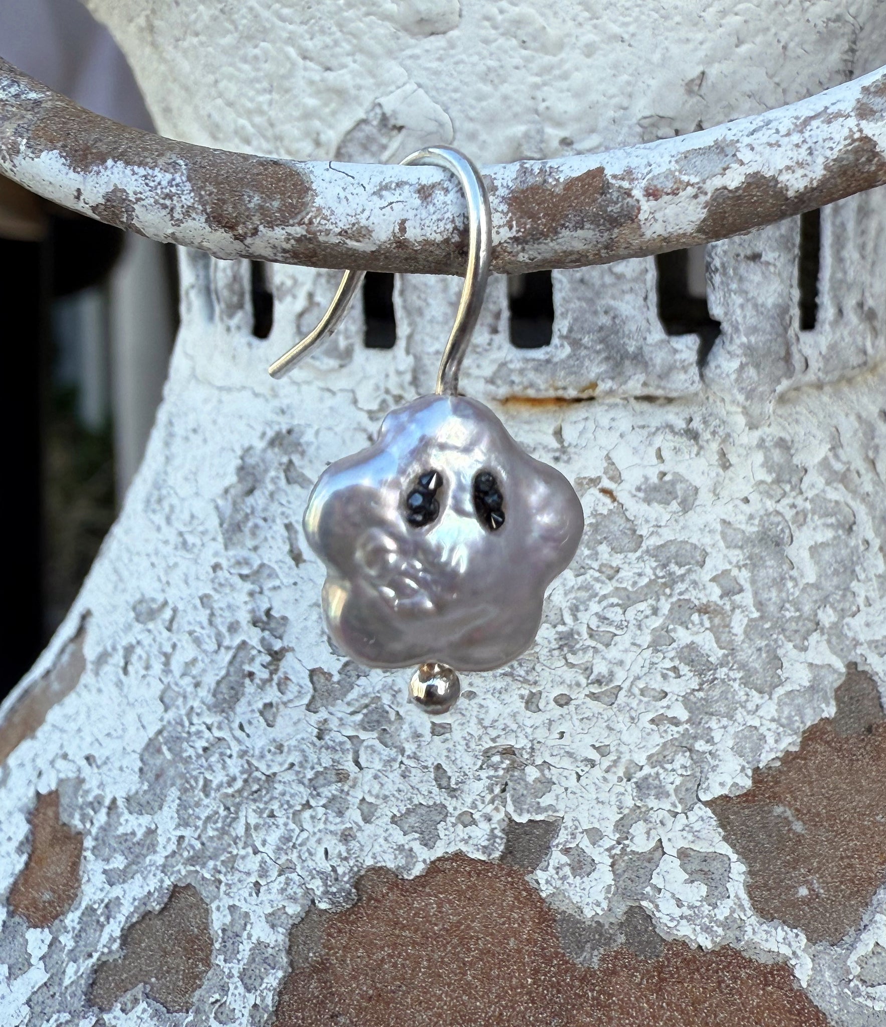 This enchanting piece features a shimmering baroque freshwater pearl meticulously shaped to resemble a cute, ethereal ghost or a Luma star from your favorite  video game 😉. The pearl's natural, iridescent luster catches the light with an otherworldly glow, making it a truly unique treasure.